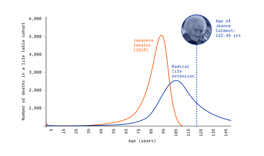 Image: Hypothetical death distribution required for a radical life extention (blue curve). Adapted from Adapted from Olshansky, S.J., et al., Nature Aging, 2024. Loading…