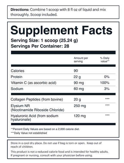 Youthful skin (plus, hair, nails, bones, and joints) requires collagen and NAD+. Unfortunately, both decline starting in our 20s. Cofactor by Elysium Health is an advanced 4-in-1 collagen system that combines: collagen peptides, nicotinamide riboside (NR), a precursor that’s clinically proven to boost NAD+, hyaluronic acid, and vitamin C.