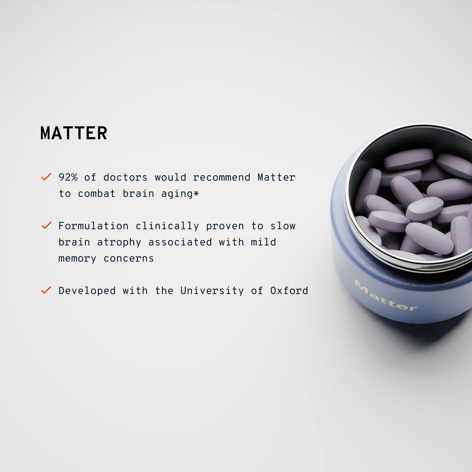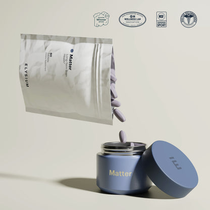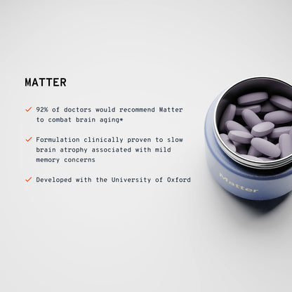 Matter is designed to support long-term brain health with a specific combination of B-vitamins (B6, folic acid and B12) that was shown in a clinical study to slow age-related brain atrophy associated with mild memory concerns, omega-3s, and a bilberry extract that is rich in plant-based antioxidants called anthocyanins. All of these ingredients have been shown, through a combination of epidemiological research and clinical trials, to support brain function.The B-vitamin complex plays an important role in maintaining normal metabolism of the amino acid homocysteine. High homocysteine levels are associated with advanced age and have been shown to correlate with the rate of brain atrophy in healthy adults. In the University of Oxford's VITACOG study, two-year supplementation with the B-vitamin complex was shown to effectively lower homocysteine levels and slow age-related brain atrophy in 168 older people with mild memory concerns. Other studies of shorter duration have indicated that the effect of B vitamin supplementation on homocysteine levels occurs in the order of a few months.